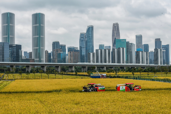 位于浙江杭州蕭山區世紀田園糧食功能區的3000多畝水稻迎來豐收。圖為10月21日,收割機在稻田里收割水稻,遠處高鐵列車飛馳而過(無人機照片)。(新華社)