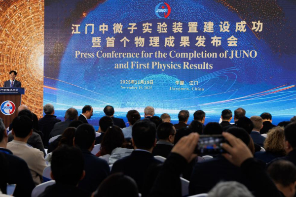 新華社廣州11月19日電(記者馬曉澄、田建川、劉禎)中國牽頭的國際合作項目江門中微子實驗(JUNO)裝置19日在廣東省江門市發布了其建成后的首個物理成果,測量出描述中微子振蕩的兩個參數,比此前實驗的最好精度提高了1.5到1.8倍。這意味著其探測器關鍵性能指標全面達到或超越設計預期。