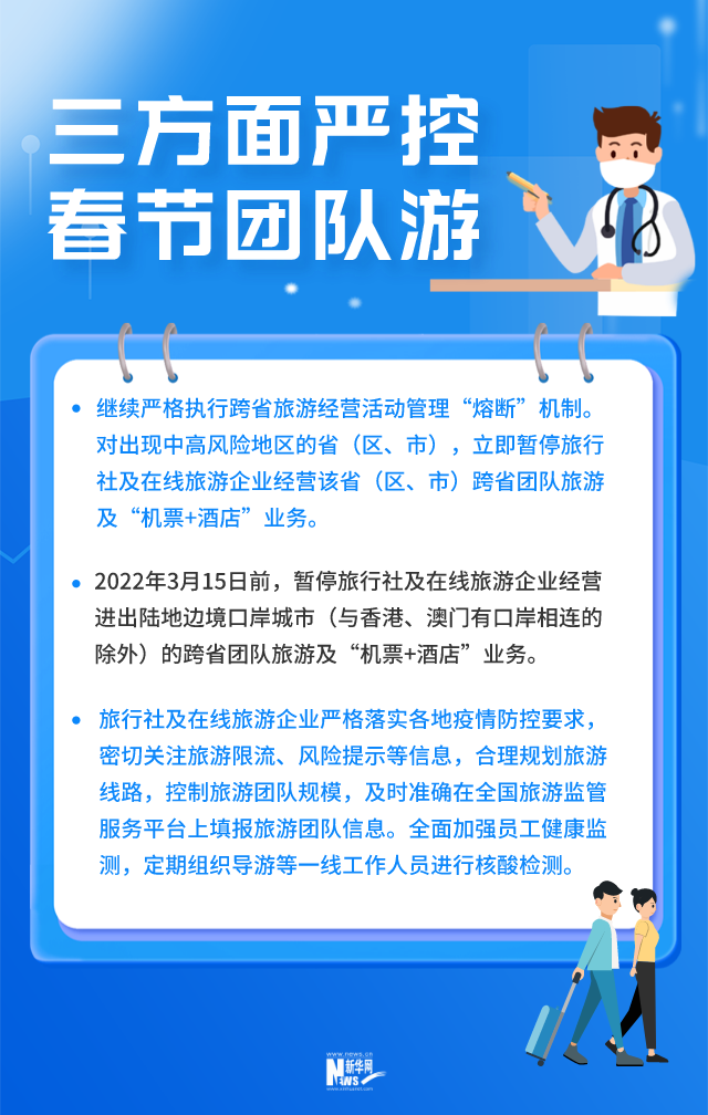 文化和旅游部市場管理司副司長余昌國在發布會上介紹,12月17日,文化和旅游部辦公廳印發《關于加強2022年元旦春節期間旅游團隊疫情防控工作的通知》,要求各地毫不放松、科學精準做好2022年元旦春節期間旅游團隊疫情防控工作,明確三方面的要求: