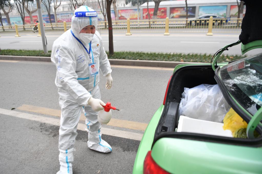 1月5日,西安“的哥”王鋒利在出發轉運核酸檢測樣本前為車輛消毒。新華社記者 張博文 攝