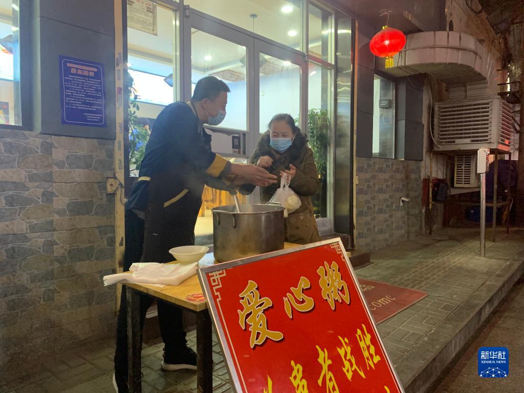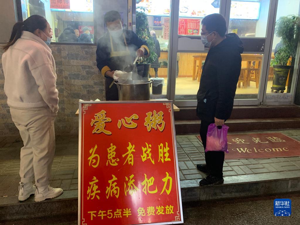 顧客在大強家常菜館外領取愛心粥(1月7日攝)。新華社記者 魏飚 攝