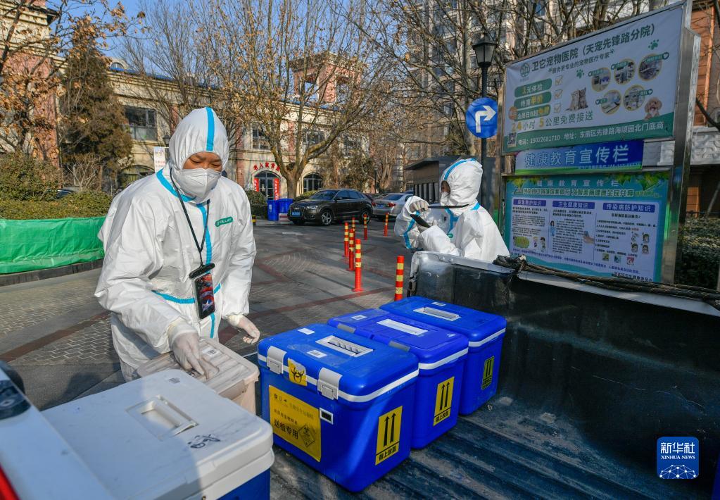 1月15日,在天津市河東區富民路街道金月灣花園社區,工作人員將核酸樣本裝車運往實驗室檢測。新華社記者 孫凡越 攝