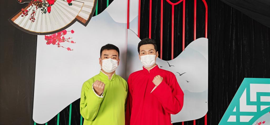 天津人民藝術劇院演員劉紀銘(左)、萬毅夫在錄制快板短視頻。(天津北方演藝集團供圖)