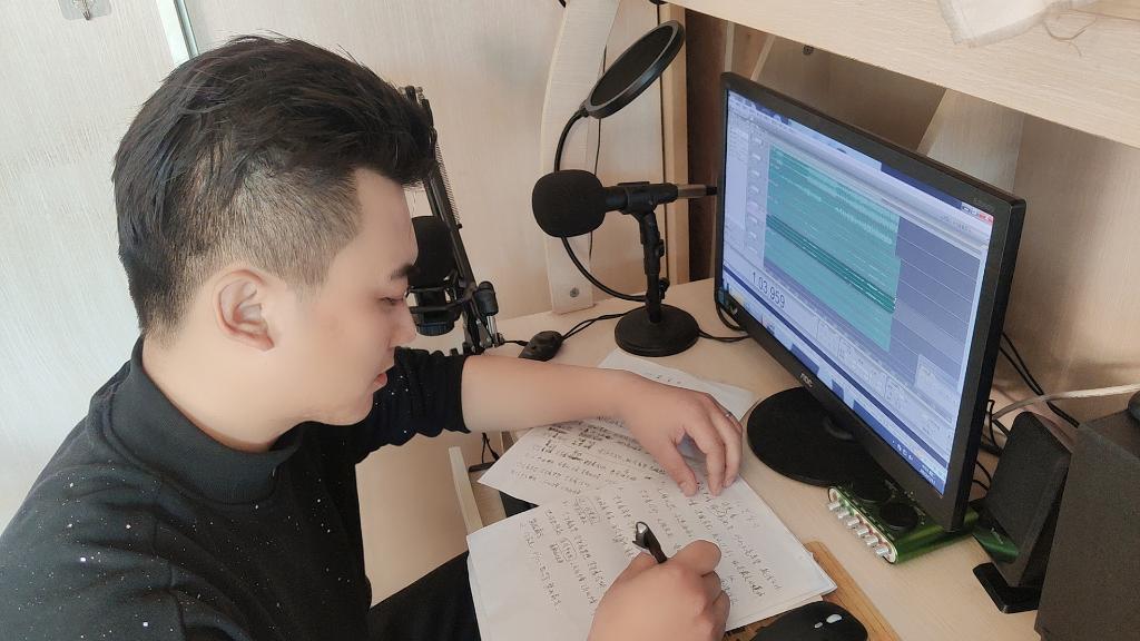 天津評劇院青年演員齊梓路在錄制評劇唱段《天津加油》。(天津北方演藝集團供圖)