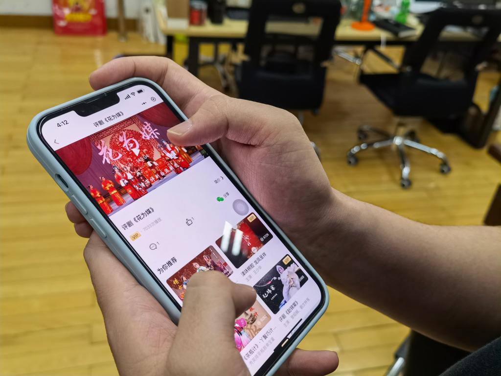 一位市民用手機上的微信小程序“小北劇場”觀看評劇《花為媒》。(天津北方演藝集團供圖)