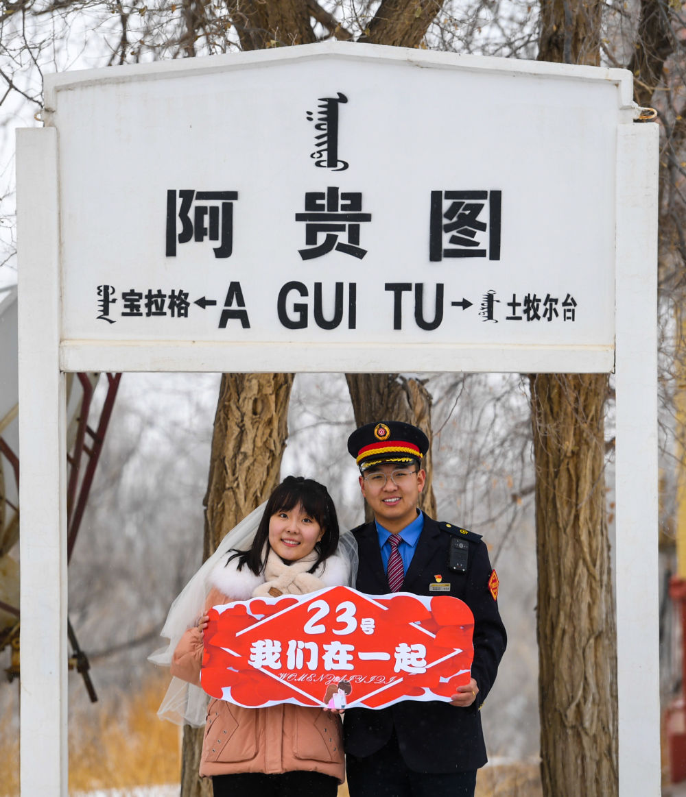 裴召勇的未婚妻張芳是包頭貨運中心大牛地車間的貨運員,兩人工作地點相距約600公里,平時聚少離多?!?3日”對裴召勇和張芳來說,意義非同一般。他倆的生日都是在23日,相識也是23日,原本計劃在2021年10月23日舉辦婚禮,但由于疫情和工作原因,他們的婚禮無奈推遲。今年春節裴召勇和張芳都要值班。為了能和裴召勇有一次短暫的相聚,倒休的張芳決定1月23日前往阿貴圖站為裴召勇送去溫暖和愛意。