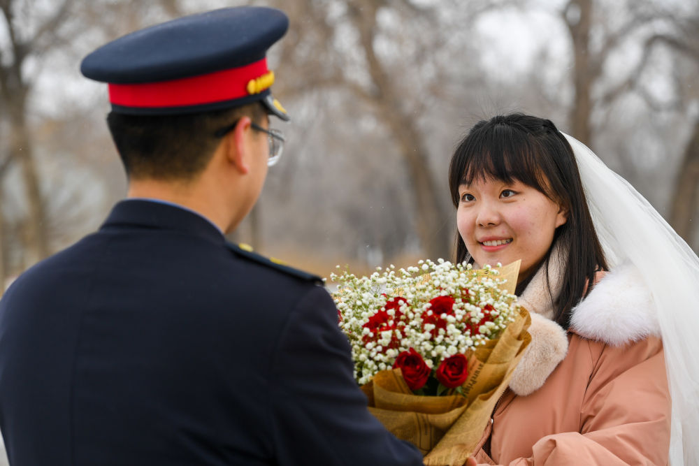 ↑1月23日,張芳(右)手捧鮮花、戴著白色頭紗出現在裴召勇面前。