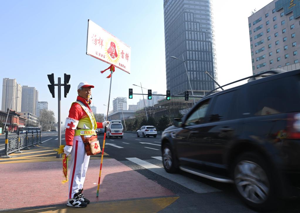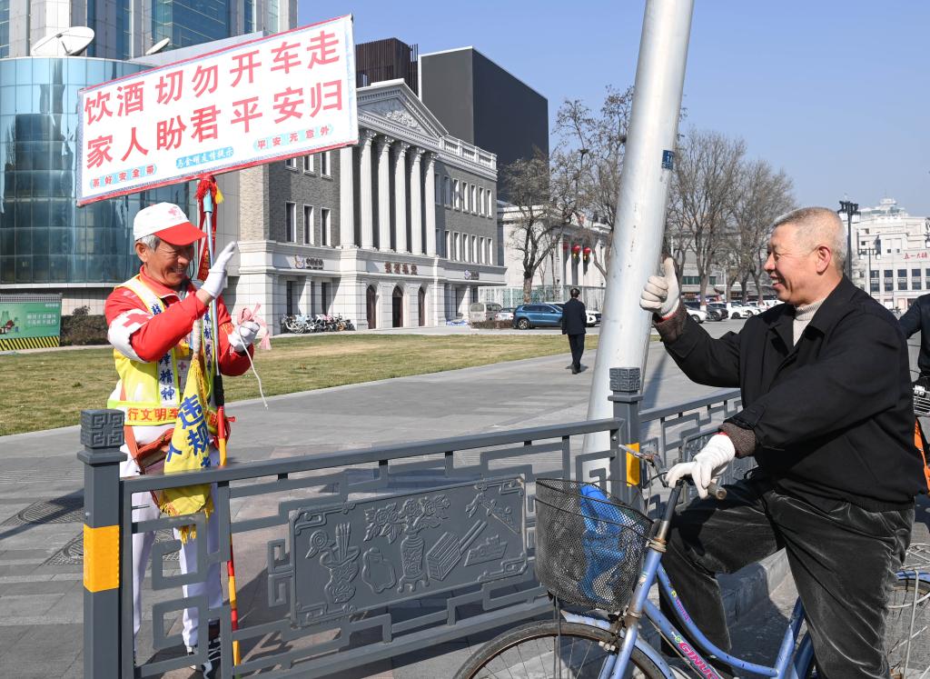 新華社太原3月4日電(記者魏飚 柴婷)“小伙子,千萬不敢開快了,安全第一?!痹谏轿魈逡粡V場東側的路口,人車喧囂中,一位老人用洪亮的嗓音,提醒外賣小哥退回斑馬線以內;看見有行人闖紅燈,他馬上說:“快退回安全線內,注意看信號燈”……