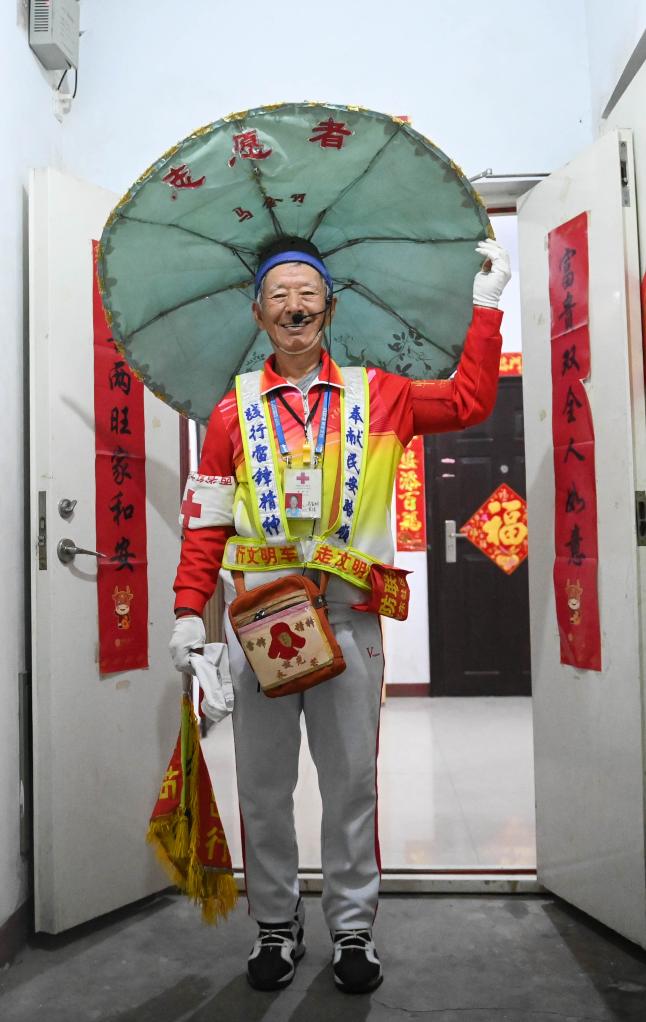 10多年來,馬金明已經勸導違規萬余人次。如今,老人的步伐雖已遲緩,走路也拄上了拐杖,但是每天值守在“崗位”上,依舊站得筆直,舉牌、打旗一招一式仍有架勢和力度。