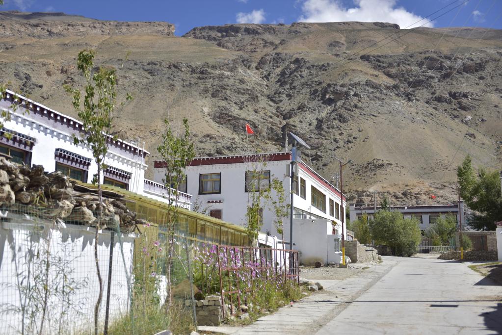 走在村里整潔的街道上,路旁一棟棟白色的藏式小院鱗次櫛比,坐在門前享受冬日暖陽的老人們臉上滿是笑意?!按罅ν七M環境整治,村里安排3名村民負責公共衛生?!睔W珠說。
