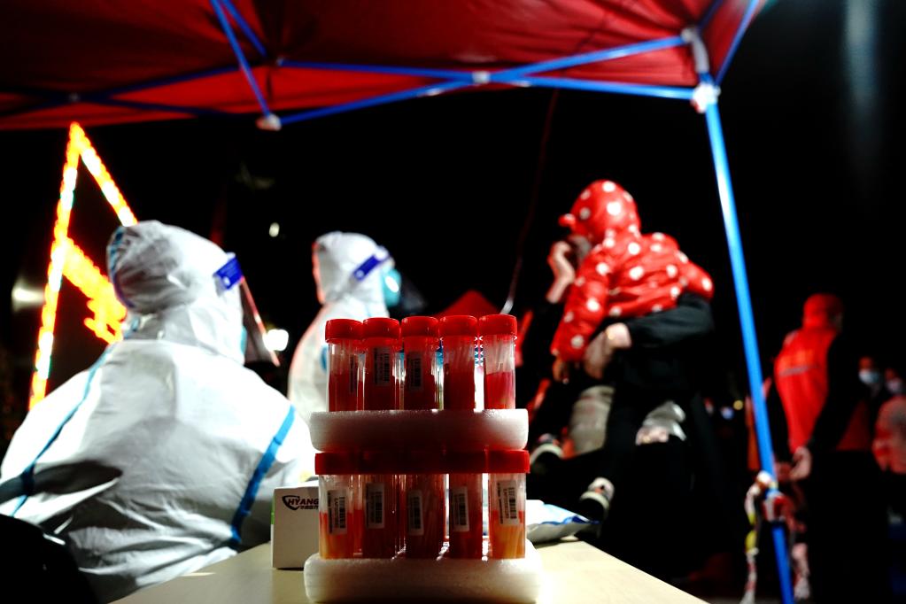 3月13日凌晨,上海市松江區洞涇鎮社區衛生服務中心的醫護人員在中海悅庭小區進行核酸采樣。新華社記者張建松攝