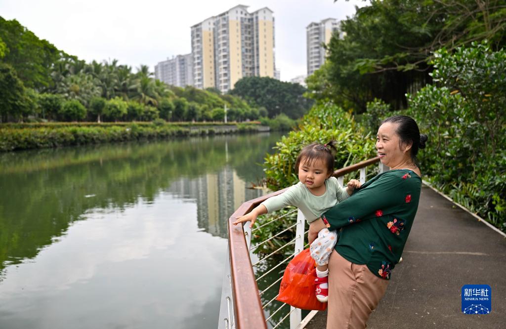 住在美舍河邊的居民張淑彩帶著孫女在河邊棧道上游玩(3月19日攝)。新華社記者 郭程 攝