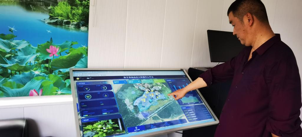 繁昌區荻港鎮桃沖村的數字青梅基地負責人陳勇通過大數據平臺查看病蟲害預警情況。新華社記者王菲 攝
