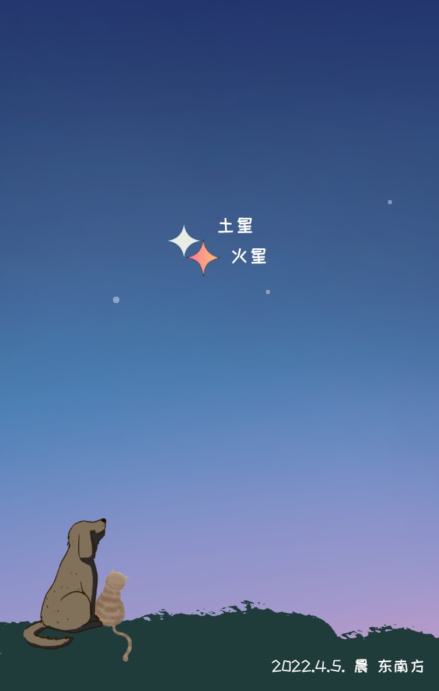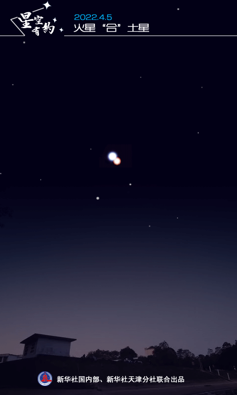 天津市天文學會理事、天文科普專家修立鵬介紹,4月5日凌晨6時5分,火星“合”土星,土星在上,火星在下。此次“相合”二者距離極近,最近時角距離僅有20角分,相當于滿月視直徑的三分之二,堪稱“親密無間”。