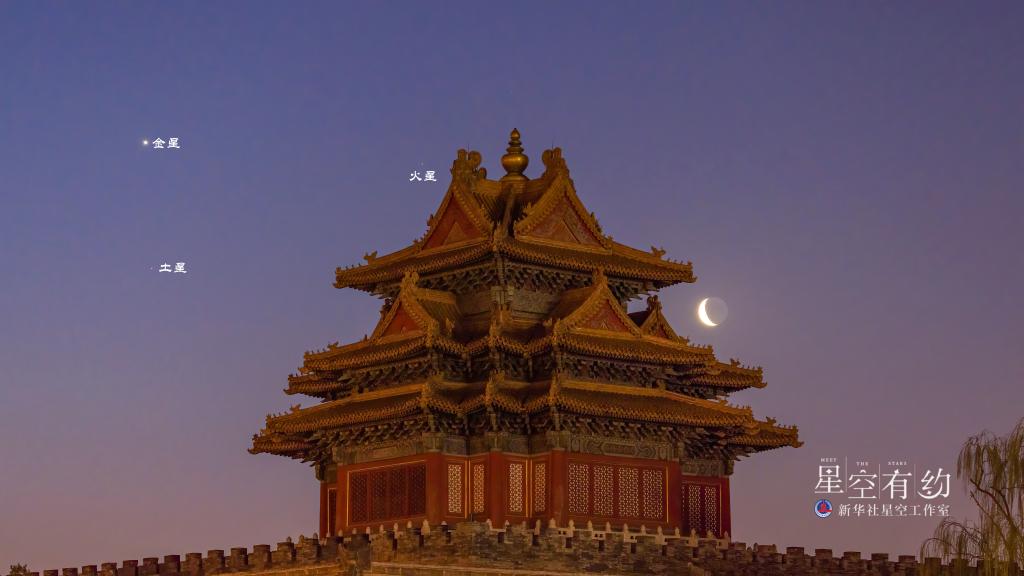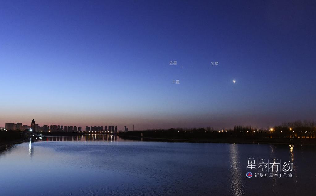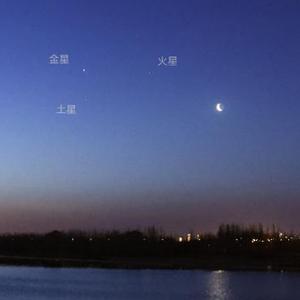 這是天津市天文愛好者楊婧2022年3月28日清晨在天津拍制的金星、火星、土星與殘月。(本人供圖)