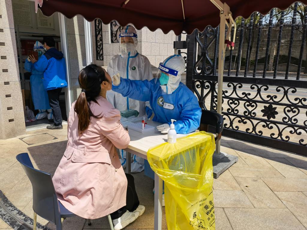 在上海市長寧區,一名武漢援滬醫務人員正在為社區居民做核酸。(受訪者供圖)