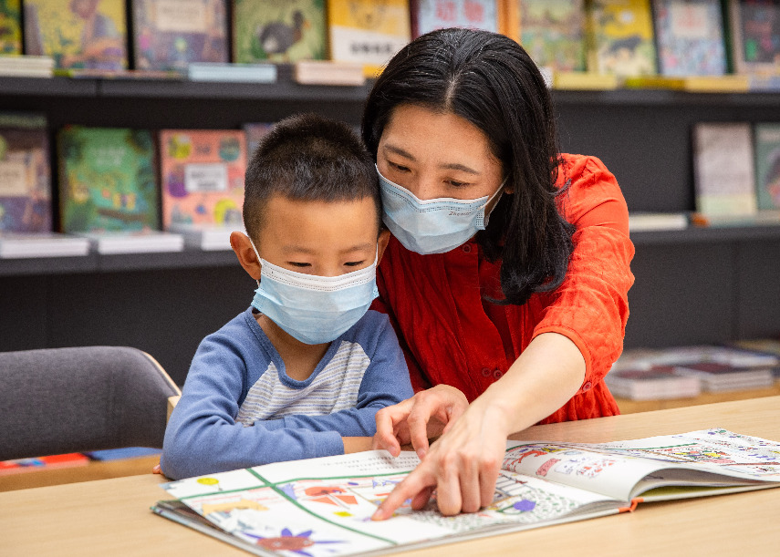 4月22日,家長帶著孩子在南京一家書城內閱讀。新華社發(蘇陽攝)