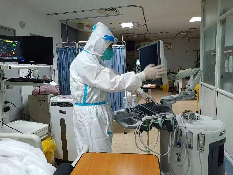 “徐敏,你要特別留意這個病人,84歲的患者周爺爺心梗,心功能差,心率慢、血壓偏低,同時患者合并有肝功能、腎功能、凝血功能等多臟器功能不全?!痹诤显疁t療隊隊員、湘雅二醫院重癥醫學科主任李金秀的指導下,徐敏和同事通過床旁超聲檢測儀器對周爺爺的心肺及其他臟器功能進行評估。