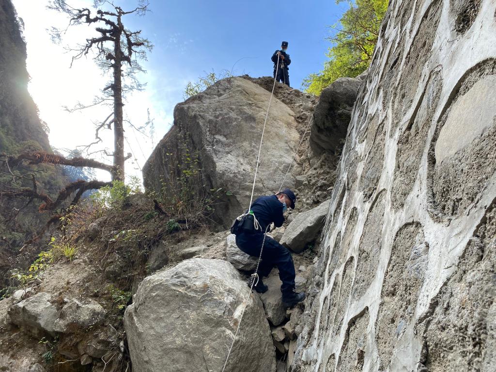絨轄邊境派出所民警吊著繩索巡邊。受訪者供圖