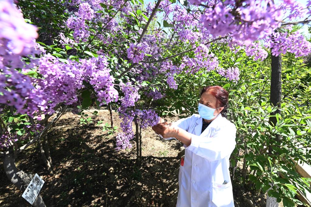 圖為5月5日在西寧市林業科學研究所,所長張錦梅查看什錦丁香長勢情況。新華社記者范培珅 攝