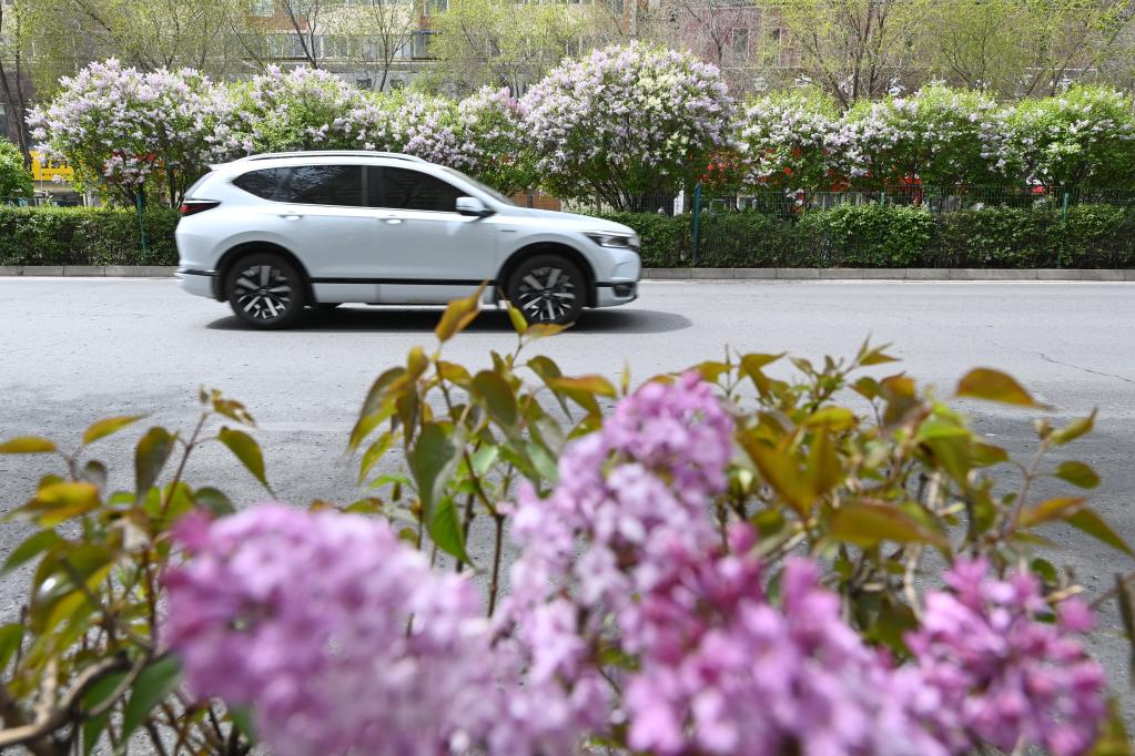 圖為4月23日在西寧市城西區昆侖西路拍攝的道路旁盛開的丁香花。新華社記者 范培珅 攝