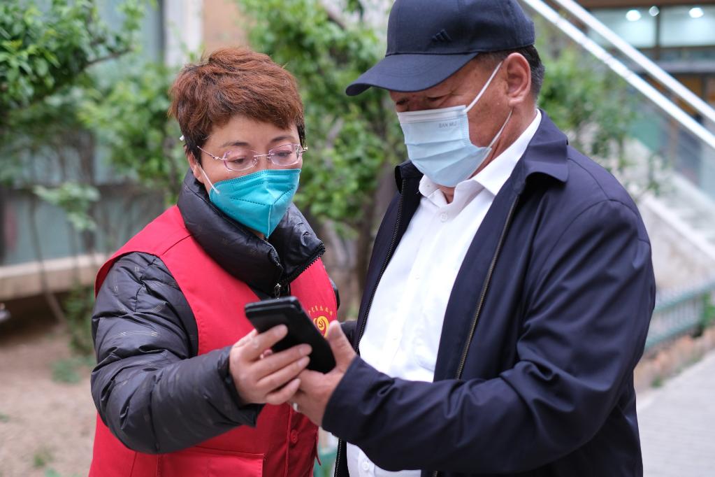 5月13日,張梅在西寧市城西區陽光華府小區核酸檢測點查驗居民的健康碼和行程碼。(新華社記者 童昊 攝)