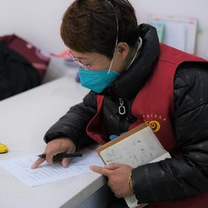 5月13日,張梅在西寧市城西區海晏路社區綜合服務中心核對志愿者信息。(新華社記者 童昊 攝)