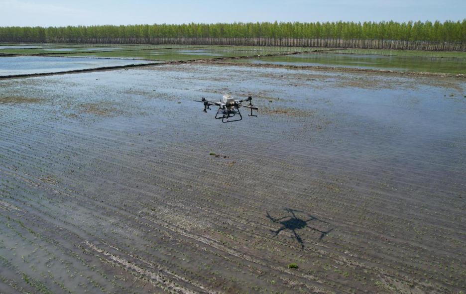 無人機的應用讓種地從面朝黑土變成了仰望藍天。在北大荒集團繁榮種畜場有限公司第三管理區水田里,滿載肥料的無人機在田野上空翻飛翱翔,種植戶馮濤正利用無人機進行施肥作業。這架無人機以每小時150畝的速度作業,噴出的肥料像白霧一樣均勻,使每株秧苗都能“雨露均沾”。