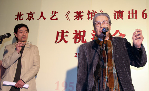 2010年3月10日《茶館》第600場演出前新老兩代演員濮存昕(左)與藍天野(右)在慶祝儀式上。(資料照片)