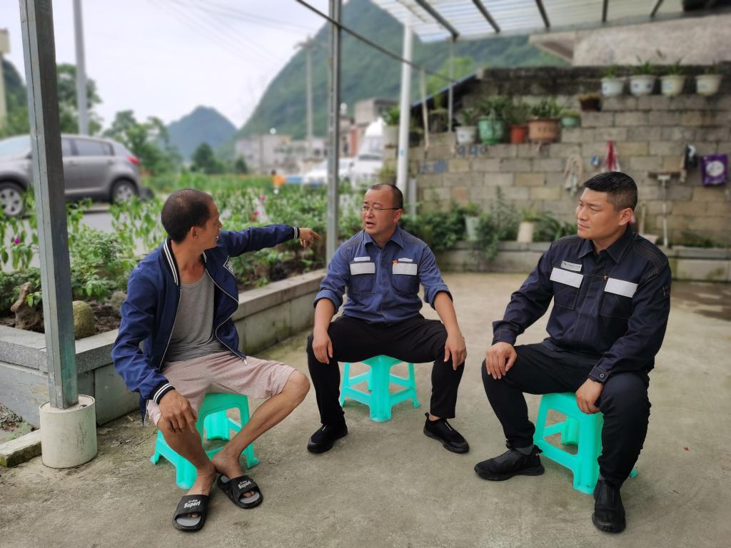 洛麥村駐村干部王維鐸(中)和卓峰(右)與村民交談。(受訪者供圖)