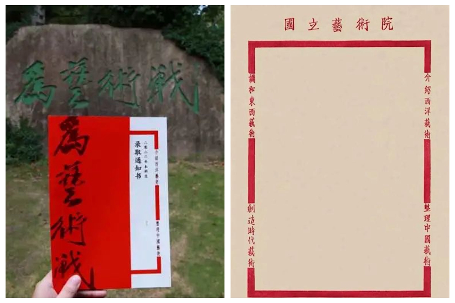 中國美術學院寄給學子們的錄取通知書封面上是林風眠先生所題“為藝術戰”四字,通知書的設計靈感源自國立藝專時期的信紙,上面還寫著“國美四句教”:介紹西洋藝術、整理中國藝術、調和東西藝術、創作時代藝術。