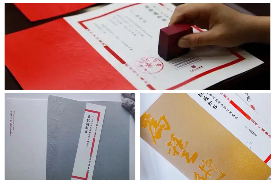 通知書在色彩上進行區分,本科生錄取通知書為紅色,象征熱情與活力,碩士錄取通知書為銀色,象征智慧與創造。博士錄取通知書為金色,象征經典與思索。