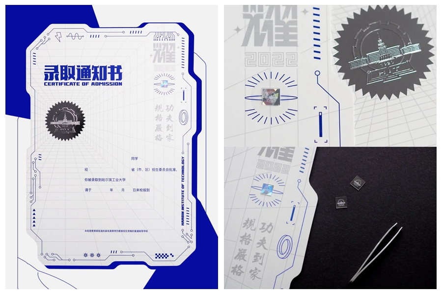2022年哈爾濱工業大學的錄取通知書外觀酷似芯片主板,科技感十足。正面封固有學校自主研制的金剛石或藍寶石,背面可呈現夜光效果。希望2022級新生通過學識的雕琢、人生的磨礪和心智的錘煉,在未來的人生路上閃耀出不一樣的光彩。