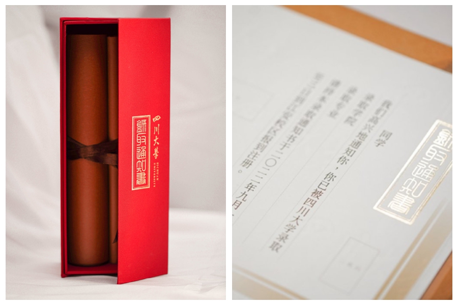 2022年四川大學錄取通知書以“錦鳳遞書”為設計概念,卷首錦鳳環繞?;?,銜來入蜀治學的喜訊。卷末海浪翻涌托舉校訓,彰顯“海納百川”的胸懷。褐金底色,不變的是歷史厚重底蘊,書卷巧思,展開的是明日坦蕩新程。