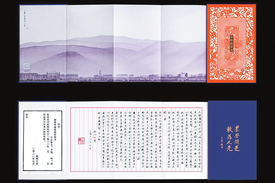 溫州大學今年的錄取通知書主打“雙非遺”特色,融入了溫州“細紋刻紙”和“木活字”兩項工藝。其中,錄取通知書的首頁是由設計師在細紋刻紙傳承人林邦棟刻畫的《魚躍龍門》上進行的二次創作,并融入了現代科技3D激光技術,用視覺設計體現透空感和3D懸浮動感。明年溫州大學將迎來90周年慶,錄取通知書內頁由木活字傳承人吳魁兆手工印刷,用小楷細述了溫州大學90年來的歷程。
