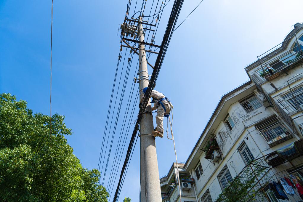 新華社合肥7月15日電(記者趙金正、劉方強)13日上午10時,烈日炎炎,熱浪翻滾,安徽省合肥市廬陽區的室外氣溫已經達到了35攝氏度。身穿純棉長袖制服的電力工人孔祥雨系上安全繩,戴好絕緣手套,穿上登桿腳扣,頂著烈日,爬上被曬得滾燙的電線桿,在離地10米的空中進行電路改造維護。