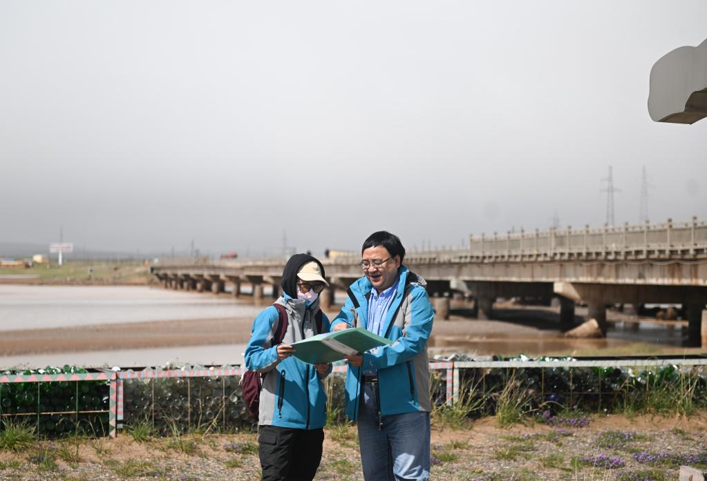 在長江源地區,焦弘睿(左)與導師在查看江源地區的資料。新華社記者 張龍攝