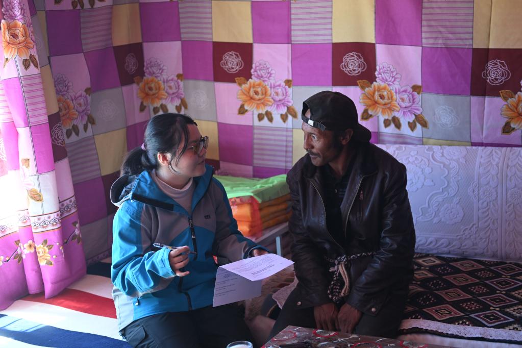 在唐古拉山鎮,汪鈺婷在牧民家中進校訪談。新華社記者 張龍攝
