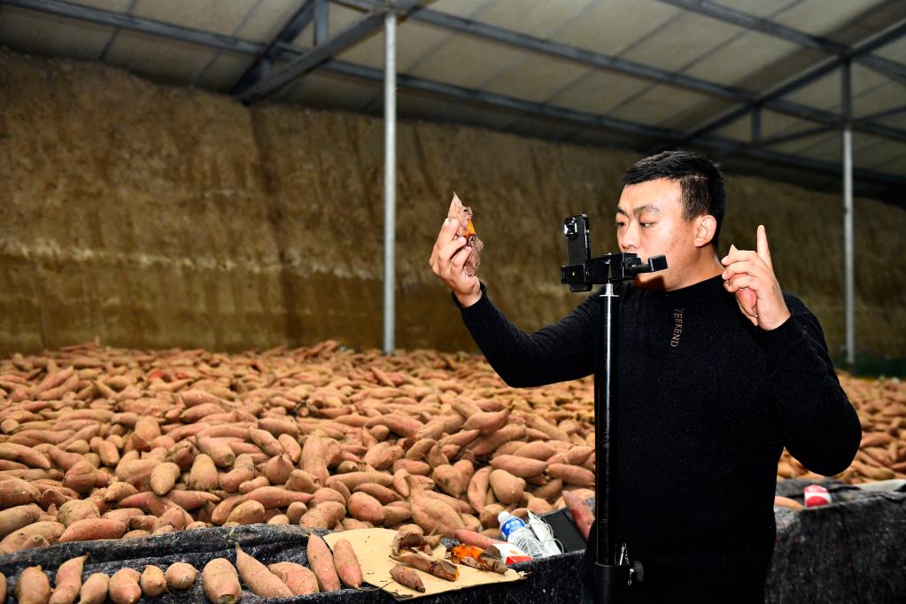 在山東一家紅薯農民專業合作社,主播在賣蜜薯。新華社記者郭緒雷 攝
