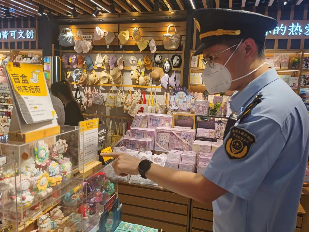 8月2日下午,上海市徐匯區市場監管局組織開展盲盒檢查,圖為執法人員檢查盲盒銷售標簽。(受訪對象提供)