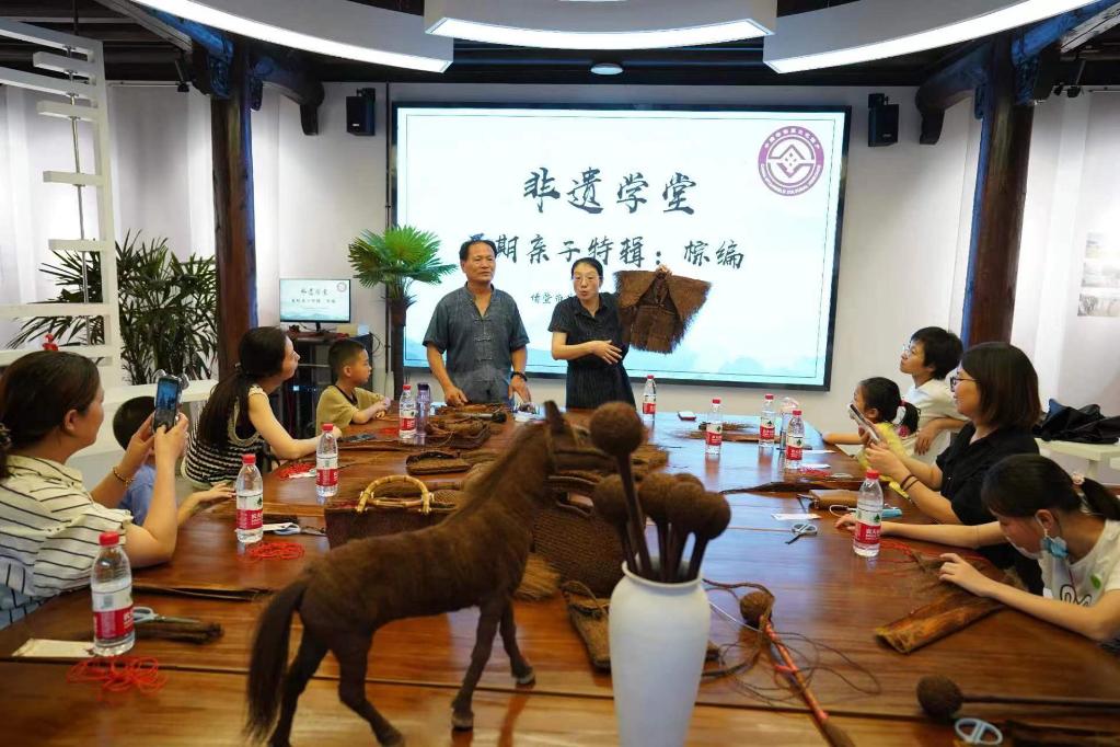7月10日,浙江諸暨“非遺學堂”暑期親子活動中,棕編工藝傳承人壽洪正在授課。(圖片由諸暨市委宣傳部提供)