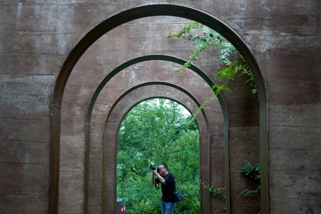 “我們的目標是把鄉村裝點得更像鄉村,把自然呵護得更加自然?!惫鶒酆驼f。如今,走遍花樹凹,最顯眼的莫過于隨處可見的大陶缸。以前用來汲水、炊煮、儲物的陶缸被注入新的生命,經過巧妙排列組合,形成了一件件極具藝術性的陶藝景觀作品。從高處俯瞰,由6666口陶瓷大缸組成的大型裝置作品《容》,宛如美麗少女,佇立山谷之間。游客沿著陶缸鋪設的“陶瓷之路”拾級而上,觀賞著山間錯落有致的梯田和花谷。