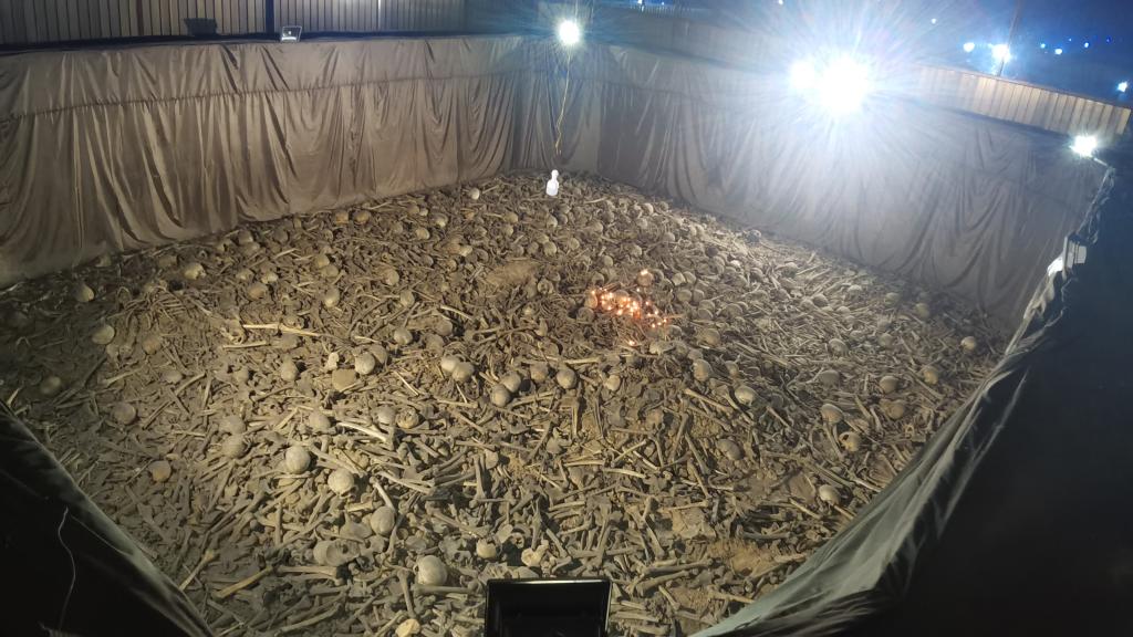 1968年10月,原鶴崗礦務局挖掘了長約40米、寬約30米、深近7米的“萬人坑”一角,僅在一處80平方米的挖掘角內,就發現千余具遺骨。有的遺骨被打折了脊柱,有的頭顱被子彈打穿,還有多具遺骨的眼眶被鐵絲穿過連在一起……