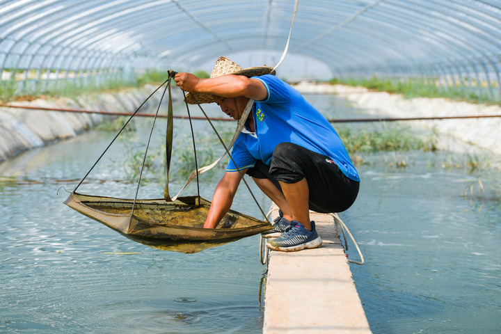8月25日,在地處黃河岸邊的內蒙古烏海市海南區巴音陶亥鎮的鹽堿水對蝦養殖園區,工作人員在查看對蝦生長情況。新華社記者 劉磊 攝