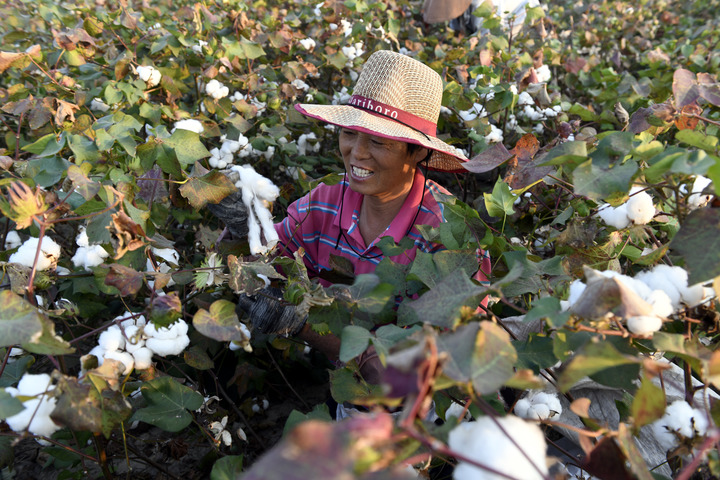 金秋時節,產棉大縣山東省濱州市無棣縣西小王鎮6萬畝鹽堿地棉花進入采收季。9月28日,山東省濱州市無棣縣西小王鎮棉農在采收新棉。新華社記者 范長國 攝