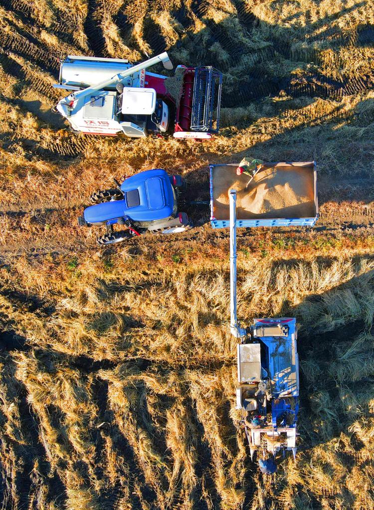 10月18日,在遼寧沈陽市沈北新區興隆臺鎮青年農場,農民把機械化收割下來的水稻裝車(無人機照片)。 新華社記者 楊青 攝