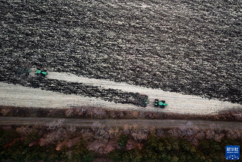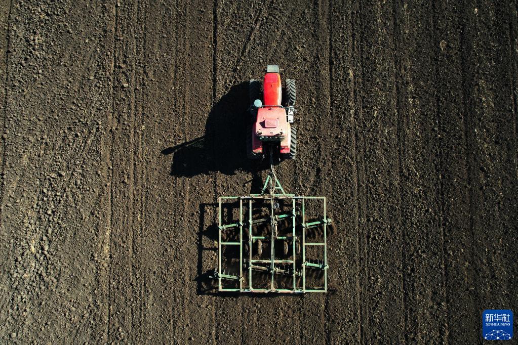 10月19日,在北大荒集團北安分公司趙光農場有限公司一處耕地,農機在進行整地作業(無人機照片)。新華社記者 王建威 攝