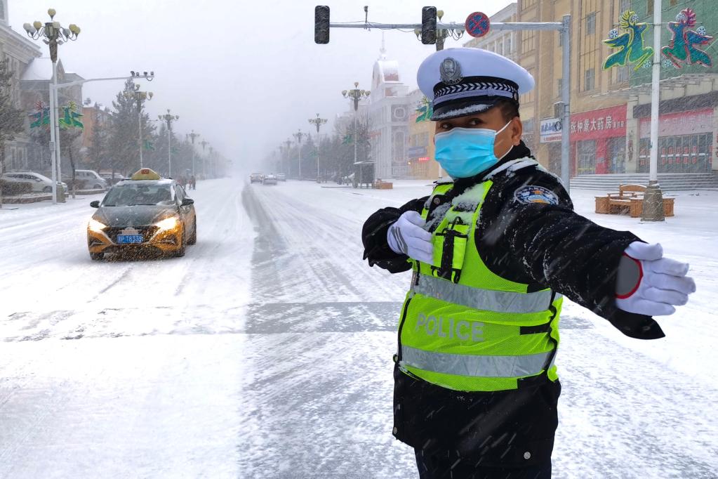 漠河市交警頂雪執勤。(受訪單位供圖)