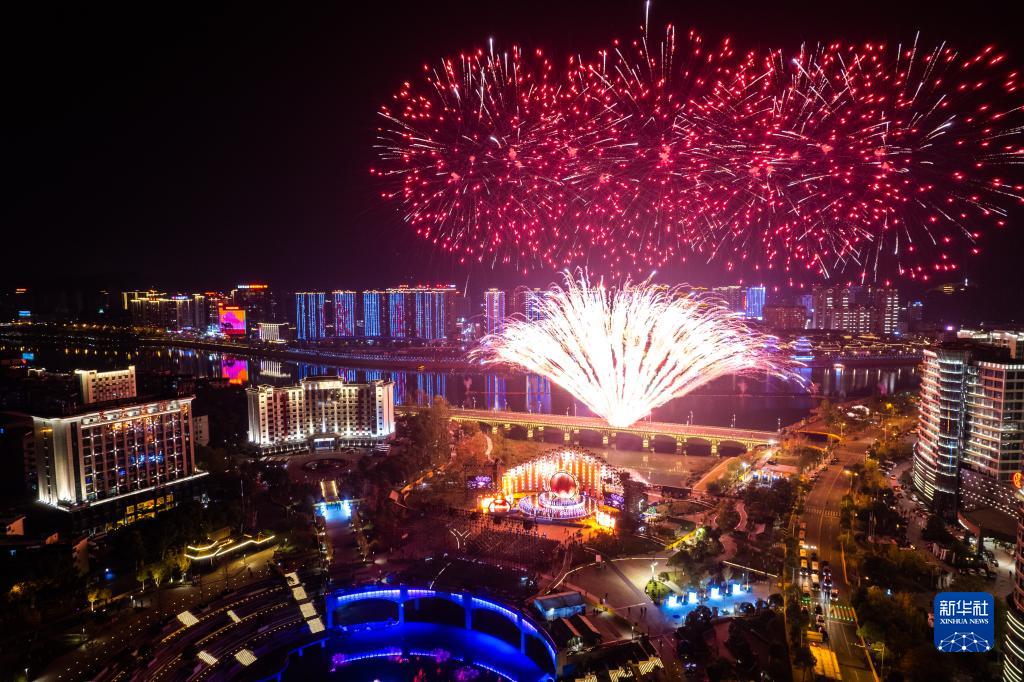 這是11月19日在張家界市民廣場拍攝的首屆湖南旅游發展大會開幕式現場(無人機照片)。新華社記者陳思汗攝