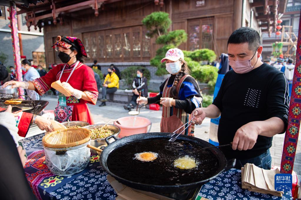 11月19日,工作人員在張家界大庸古城非遺街區制作美食。新華社記者陳思汗攝